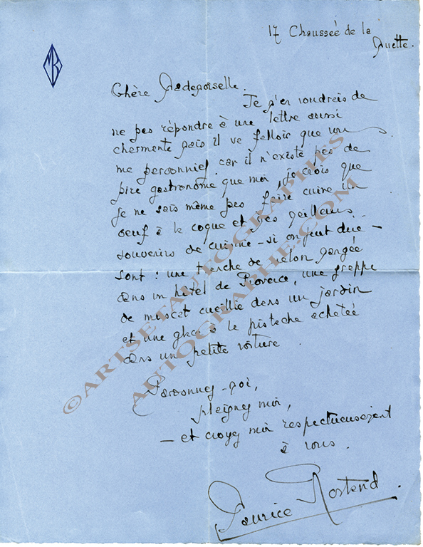 Lettre autographe signéeLettre autographe signée, adressée à une demoiselle. 1 page in-4°.« Je m’en voudrais de ne pas répondre à une lettre aussi charmante mais il va falloir que vous me pardonniez car il n’existe pas de pire gastronome que moi, je...