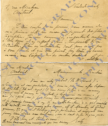 2 cartes pneumatiques, autographes signéesEnsemble de 2 cartes pneumatiques, autographes signées, adressées à M. Georges Moreau de la Revue Encyclopédique Larousse.— [Paris, 1897] ; 30 X 74 mm oblongue. « J’ai une commission importante aujourd’hui à trois heures et un...