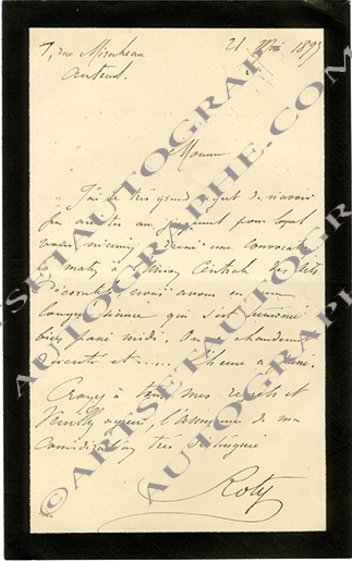 Lettre autographe signéeLettre autographe signée, adressée à M. Georges Moreau de la Revue Encyclopédique Larousse. Auteuil, 21 mai 1895 ; 1 page in-8° sur papier de deuil. « J’ai le très grand regret de n’avoir pu assister au jugement pour lequel vous...