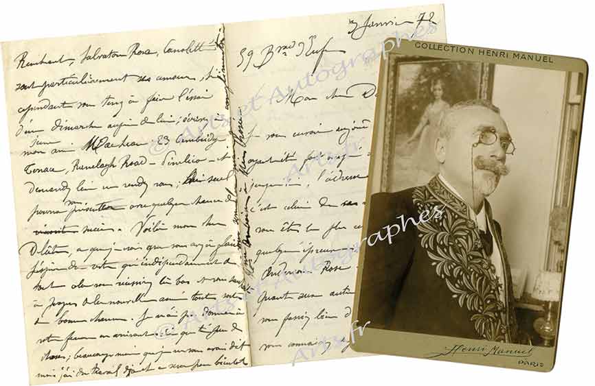 Ensemble de 20 lettres ou cartes autographes signées et documents diversEnsemble de 20 lettres ou cartes autographes signées, adressées au docteur Brochin et à divers (Delâtre, E. Daudet, etc.). Lettres intéressantes sur sa santé.On joint une photographie format cabinet d’Henri Manuel, le représentant...