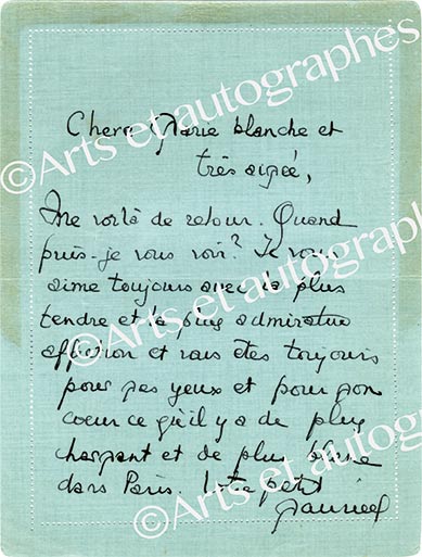 Lettre autographe signéeLettre autographe signée, adressée à sa « Chère Marie-Blanche et très aimée ». Sans date ; 1 page in-8°. « Me voilà de retour. Quand puis-je vous voir ? Je vous aime toujours avec la plus tendre et la plus admirative affection et...