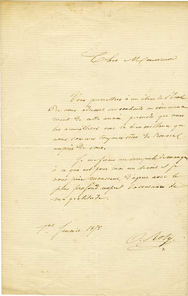 Lettre autographe signéeLettre autographe signée. 1er janvier 1872; 1/2 page in-8°. «Vous permettrez à un élève de l’École de vous adresser ses souhaits au commencement de cette année, persuadé que vous les accueillerez avec la bienveillance que nous...
