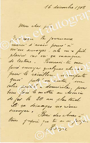 Lettre autographe signéeLettre autographe, signée « Rodolphe », adressée à son père Camille Pissarro. 16 décembre 1902 ; 1 page in-8°. « J’ai reçu les journaux, merci d’avoir pensé à m’en envoyer, cela m’a fait plaisir car ici ça manque de...