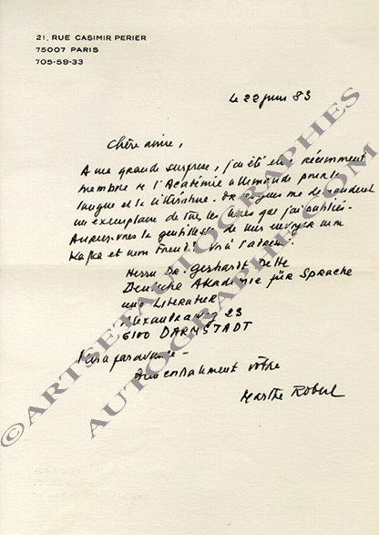 Lettre autographe signéeLettre autographe signée, adressée à Mme Daix. Paris, 22 juin 1983 ; 1 page in-8°, enveloppe timbrée jointe.« À ma grande surprise, j’ai été élue récemment membre de l’Académie allemande pour la langue et la littérature....