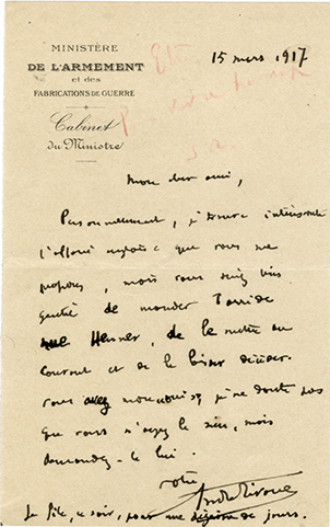 Lettre autographe signéeLettre autographe signée. 15 mars 1917 ; 1 page in-12. « Personnellement, je trouve intéressante laffaire anglaise que vous me proposez, mais vous seriez bien gentil de mander Tarride rue Henner, de le mettre au courant et de le...