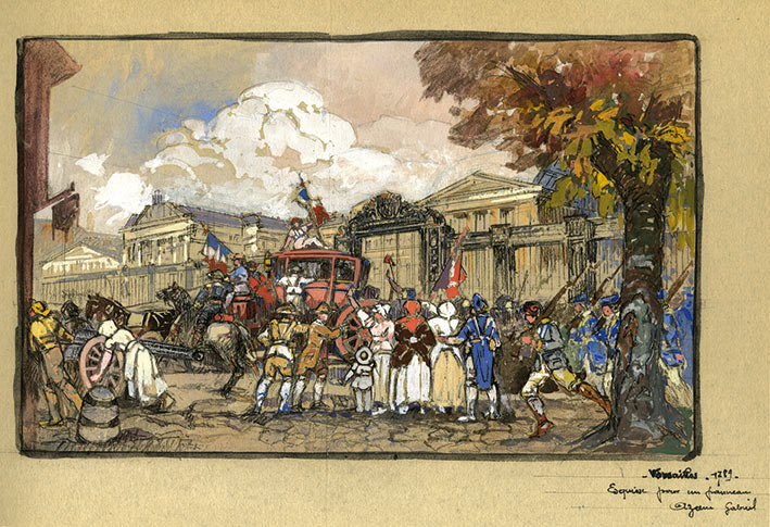 Dessin gouachéDessin gouaché représentant le transfert de Louis XVI de Versailles à Paris. XXe siècle ; 380 X 240 mm. La scène représente le carrosse entouré de révolutionnaires sortant de la cour du château de Versailles. Dans le bas à droite...