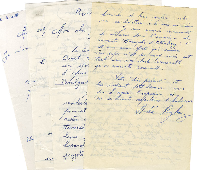 Ensemble de 4 lettres autographes signéesEnsemble de 4 lettres autographes signées. 1971-1986 ; 7 pages in-8°. Lettres intéressantes sur son activité de metteur en scène : « J’ai relu, montre en main, Saul de Tarse, j’ai compté 2 h.05. J’imagine des jeux de scène et...
