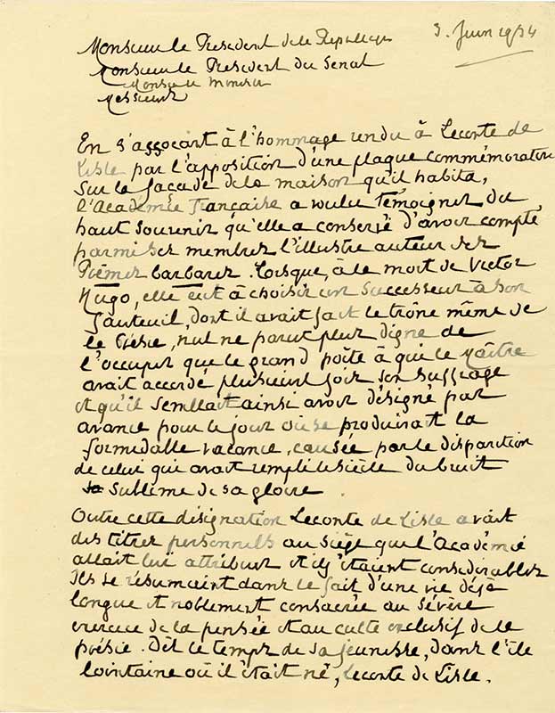 Manuscrit autographe d'Henri de RégnierManuscrit autographe de la main d’Henri de Régnier, du discours prononcé à l’inauguration d’une plaque commémorative à Leconte de Lisle apposée sur son domicile du 64 boulevard Saint-Michel à Paris. 3 juin 1934 ; 5 pages in-4°...