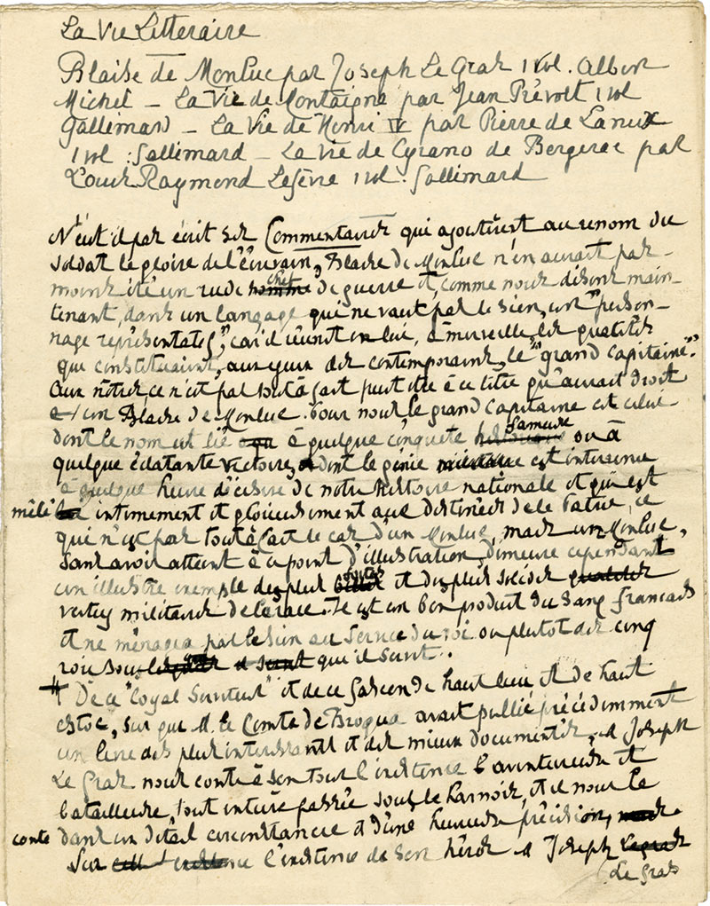 Manuscrit autographe signéManuscrit autographe signé. [1927] ; 5 pages in-4°. Dans sa rubrique « La Vie littéraire » au Figaro, il évoque les dernières parutions : Blaise de Montluc par Joseph Le Graz paru chez Albin Michel, La vie de Montaigne par Jean...
