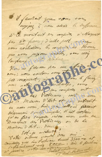 Lettre autographe signéeLettre autographe signée, adressée à M. Gallois, directeur du Courrier de la Presse. Paris, 8 décembre 1900 ; 2 pages in-8°, en-tête imprimé deLa Maison d’Art, enveloppe timbrée jointe. « Je ne vous apprendrais rien en vous...