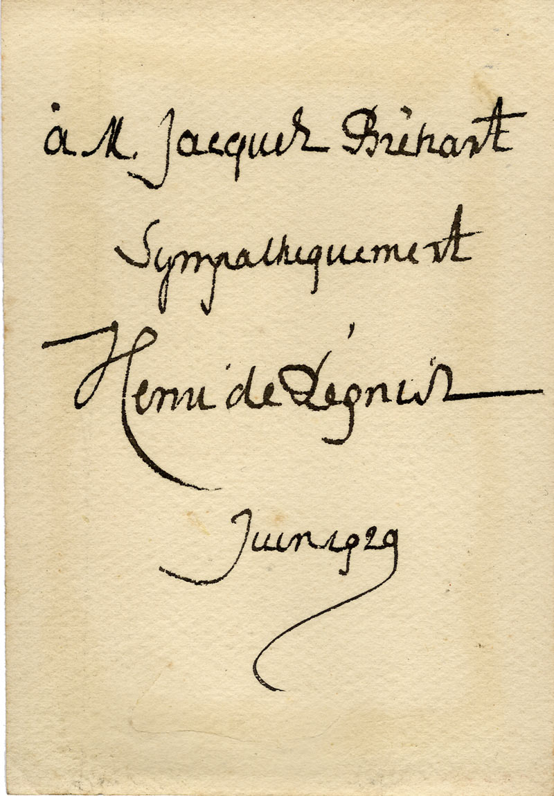 Photographie avec, au verso, une dédicace autographe signéePhotographie avec, au verso, une dédicace autographe signée, adressée à M. Bréhant. Juin 1929 ; 11,8 x 8 cm. « À Jacques Bréhant, sympathiquement Henri de Régnier ». Portrait en tenue d’académicien et en buste.