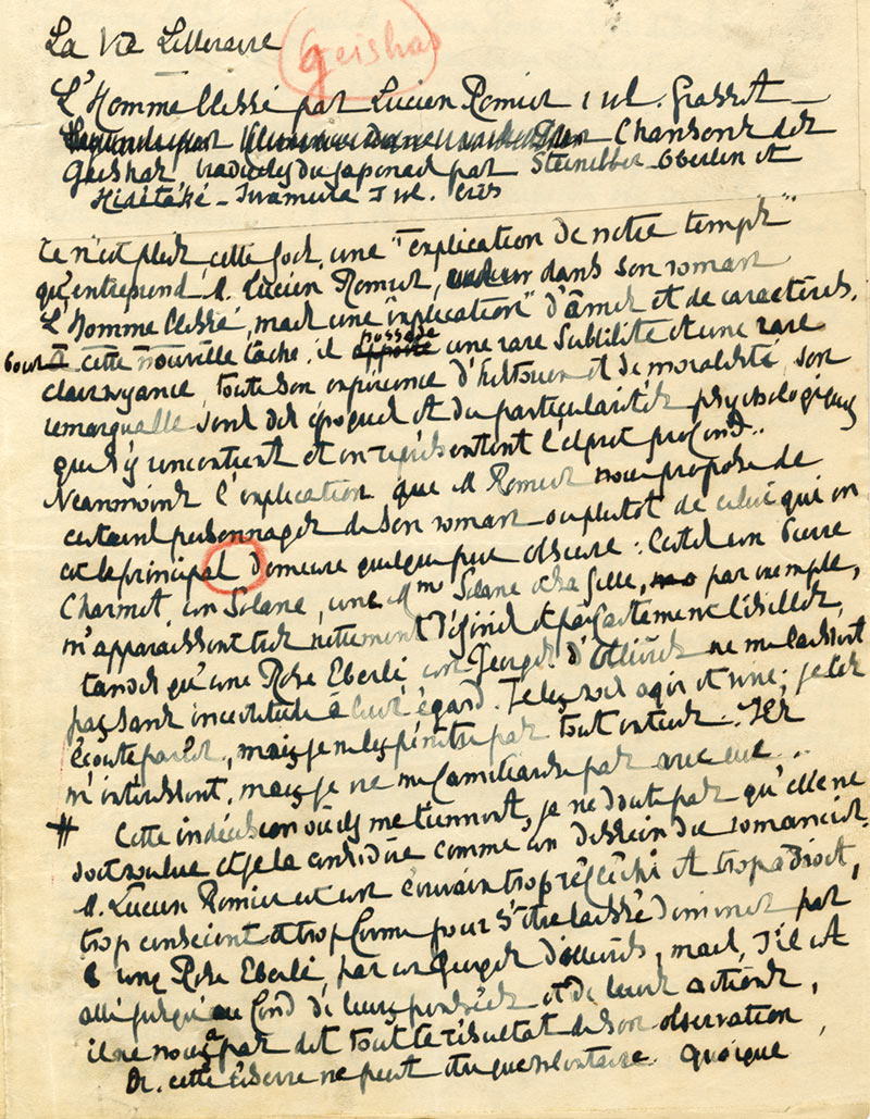 Manuscrit autographe signéManuscrit autographe signé. [1926] ; 7 pages in-4°. Dans sa rubrique « La Vie littéraire » au Figaro, il évoque les dernières parutions : L’Homme blessé de Lucien Romier qui est paru chez Grasset, et le livre japonais qui vient...