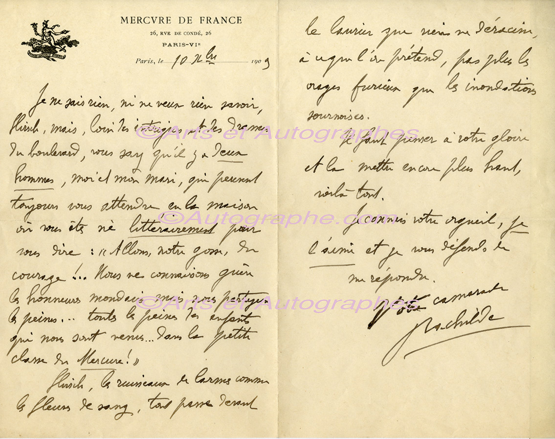Lettre autographe signéeLettre autographe signée, adressée à Charles-Henry Hirsch. 10 décembre 1909 ; 2 pages in-8°. Magnifique lettre dans laquelle elle revendique une fois de plus son statut “d’homme de lettres” : « Je ne sais rien, ni ne veux rien...