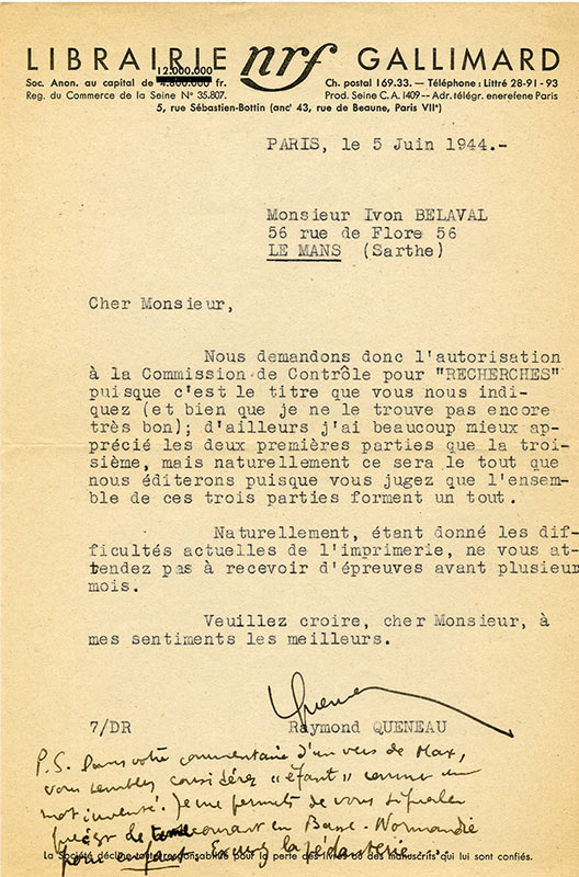 Ensemble de 3 lettres signéesEnsemble de 3 lettres signées, dont l’une avec 5 lignes autographes, adressées au philosophe Yvon Bélaval. 1944-1947 ; in-8° et in-4°. En-têtes de « la Librairie Gallimard, NRF. »— 5 juin 1944. « Nous demandons donc...