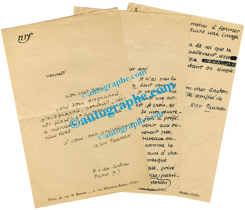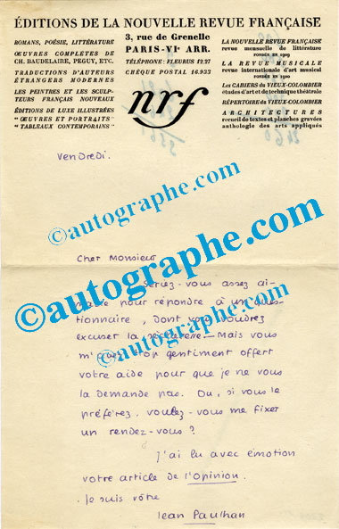 Lettre autographe signéeLettre autographe signée. « Vendredi » ; 1 page in-8°. En-tête imprimé « NRF ». « Seriez-vous assez aimable pour répondre à un questionnaire, dont vous voudrez excuser la sécheresse — mais vous m’avez trop gentiment offert...