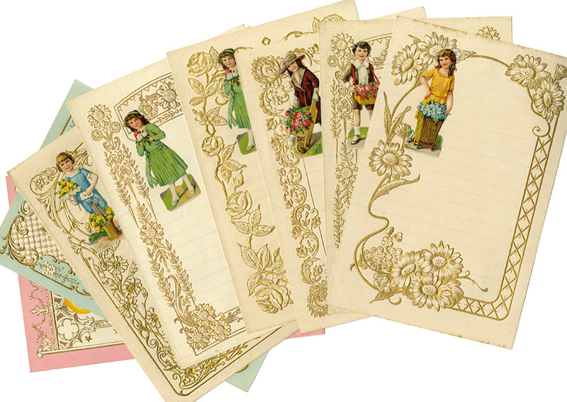 Ensemble de 9 lettres de vœuxEnsemble de 9 lettres de vœux, vierges. Formats in-8°. Joli ensemble de papiers à lettres décorés de frises décoratives en relief, dorées. 7 comportent des chromos de jeunes enfants offrant des paniers de fleurs, 2 autres sont avec...