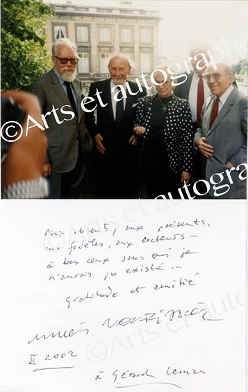 Photographie dédicacéePhotographie dédicacée à Gérard Leman. 2002 ; photographie collée sur un carton format in-8°. « Aux absents, aux présents, aux fidèles, aux auteurs, à tous ceux sans qui je n’aurais pu exister... Gratitude et amitié. François...