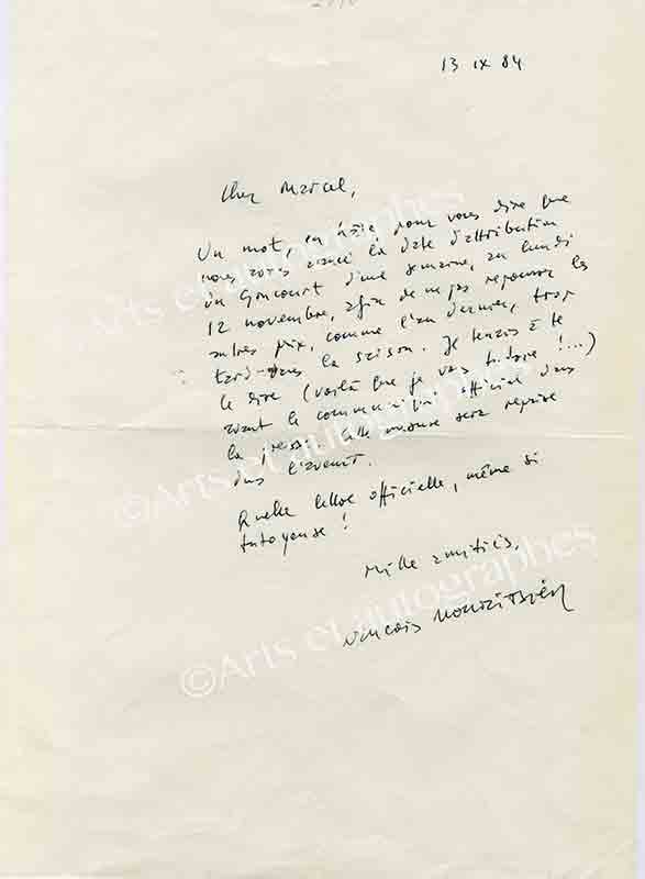 Lettre signéeLettre signée, adressée à Roger Bornand. Paris, 5 octobre 1987 ; 1 page in-4°. En-tête de l’académie Goncourt. Enveloppe jointe. François Nourissier explique à son correspondant les modalités pour se procurer une de ses...