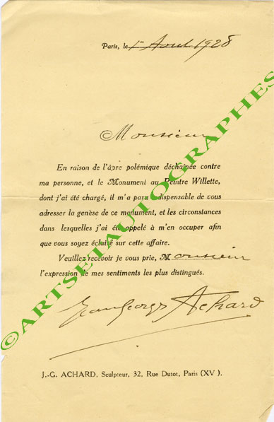 Carte autographe signéeEnsemble de 3 cartes autographes signées et d’1 lettre signée :— Paris, le 30 octobre 1927 ; 140 X 90 mm. Au dos d’une carte postale représentant son ensemble « Apothéose de la Cuisine Française ». « Ma femme est fort...