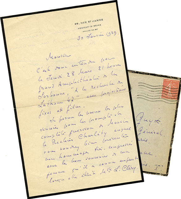 Lettre autographe signéeLettre autographe signée, adressée à Maurice Guyot. Neuilly-sur-Seine, 30 janvier 1929 ; 1 page 1/2 in-8°, enveloppe jointe. « Cest donc entendu pour le jeudi 28 mars 21 heures grand amphithéâtre de la Sorbonne, À la recherche du...