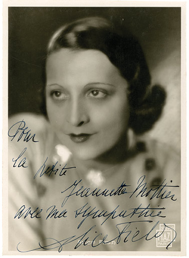 Photographie autographe signée, dédicacéePhotographie signée avec dédicace autographe adressée à Mme Jeanne Mottier. 18 x 13 cm. Photographie Studio Piaz, Paris.