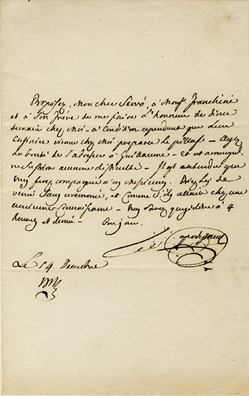 Lettre autographe signéeLettre autographe signée, adressée à M. Servio. 14 décembre [1813-1814] ; 1 page in-8° « Proposez, mon cher Servio, à Monsr. Franchini et à son frère de me faire lhonneur de dîner chez moi, à condition cependant que leurs...
