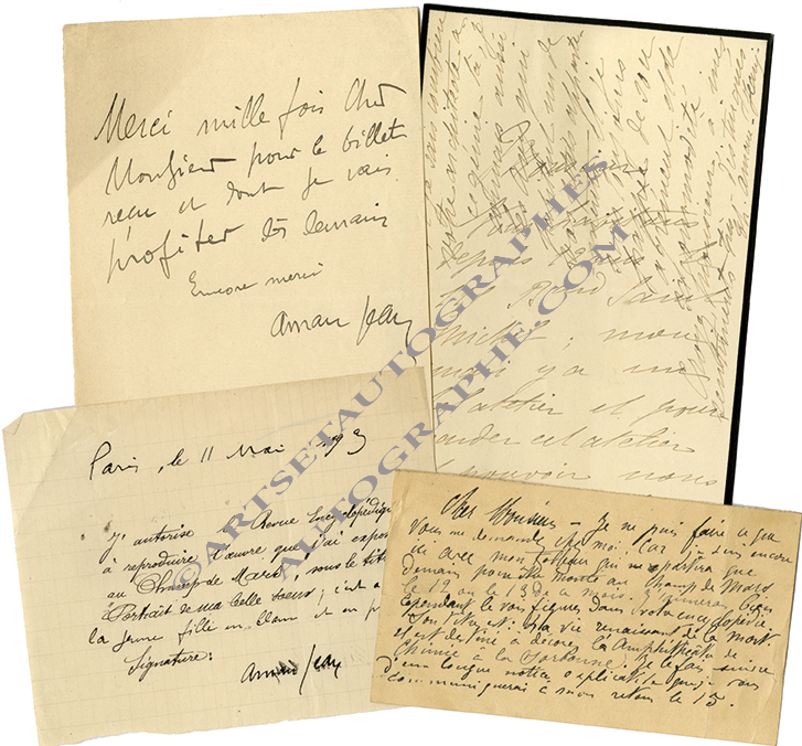 Ensemble de lettres autographes signées3 lettres autographes signées, adressées à Georges Moreau, directeur de la Revue Encyclopédique Larousse. Formats divers. Il est question dans cette petite correspondance d’autorisations de reproductions d’œuvres dont en mai 1893,...