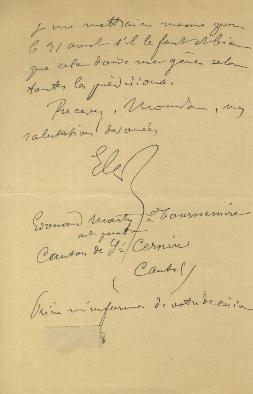 Lettre autgraphe signéeLettre autographe signée adressée à Mr Rochet (marchand de pastels). Tournemire, 15 juillet 1901 ; 2 pages in-8°. Lettre au sujet d’une traite, dont il souhaite reporter l’échéance. ...