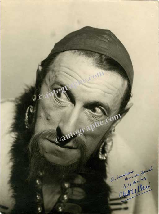 Photographie signée.Photographie autographe signé. 14 décembre 1944 ; 240 x 180 mm. Grande photographie représentant l’acteur dans le rôle de Shylock dédicacée : « À Madame Joutel. Le 14 déc. 44 Ch. Dullin ».