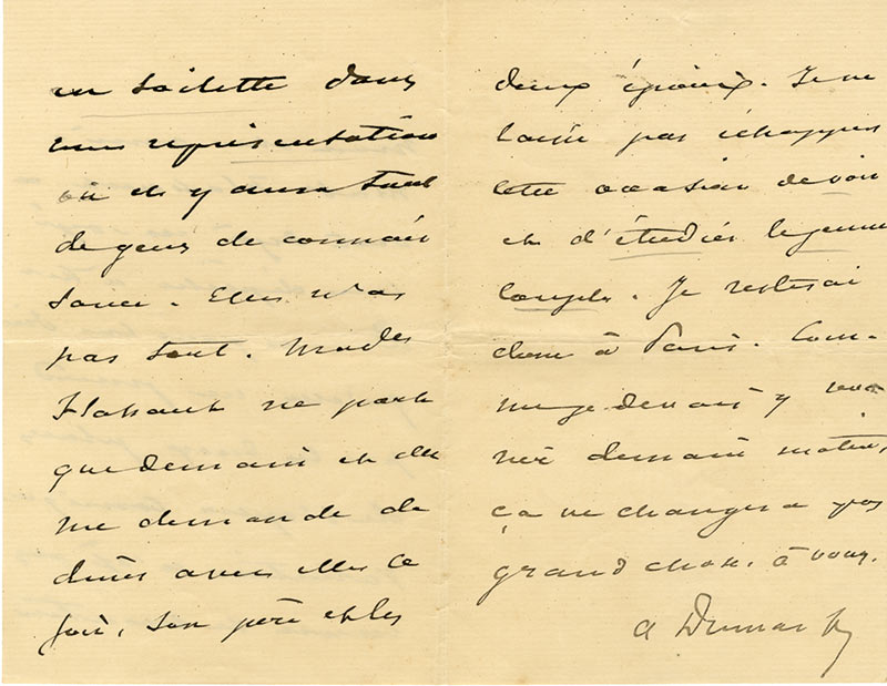 Lettre autographe signéeLettre autographe signée. Sans date ; 3 pages in-8°. Madame Flahaut a « déjà envoyé une dépêche à Mr Dumas pour lui dire qu’elle ne prend pas les deux places de l’Opéra comique. Valentine n’ose pas encore se montrer en...