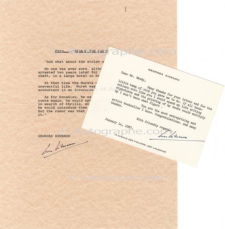 Deux pièces signées.2 pièces signées :— Extrait tiré de Aboard the Aquitaine. 1/2 page in-4° sur papier saumon, en anglais. « And what about the stolen wallet ?… No one was ever sure, although Grenier was arrested two years later for the same sort of...