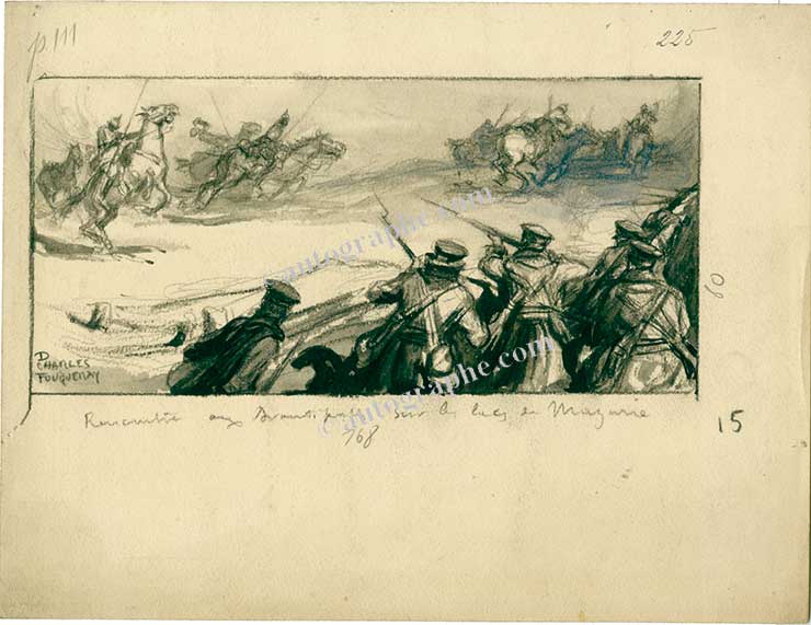 DessinRencontre aux avant-postes sur le lac de Mazurie.Dessin au fusain rehaussé à la gouache.Signé en bas à gauche.10,2 X 21,4 cmCe dessin a été publié dans l’ouvrage “La guerre racontée par nos généraux”. Nous joignons la...