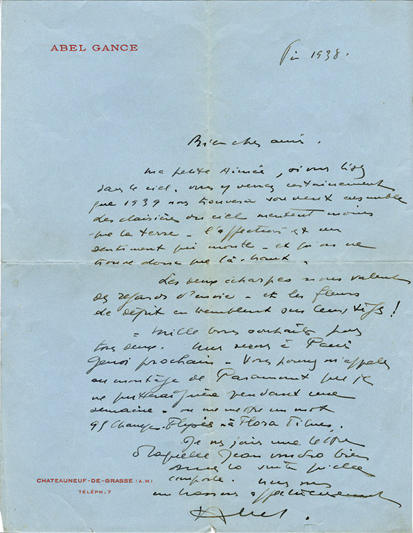 Lettre autographe signéeLettre autographe signée, adressée à M. et Mme Tedesco. « Fin 1938 » ; 1 page in-4° sur papier bleu à son nom gravé en rouge. ...