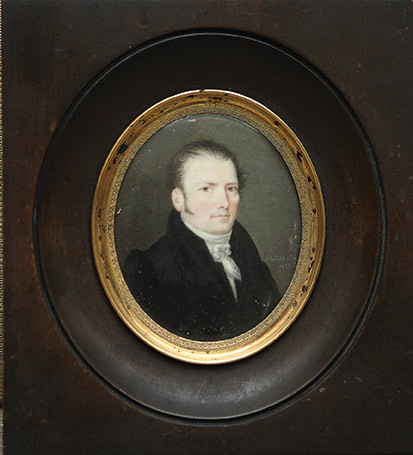 Miniature ovale, sur ivoire, signée PhilippotPortrait d'homme à l'habit noir. 1829. 51 x 63 mm. Miniature ovale, sur ivoire, signée Philippot et datée 1829.