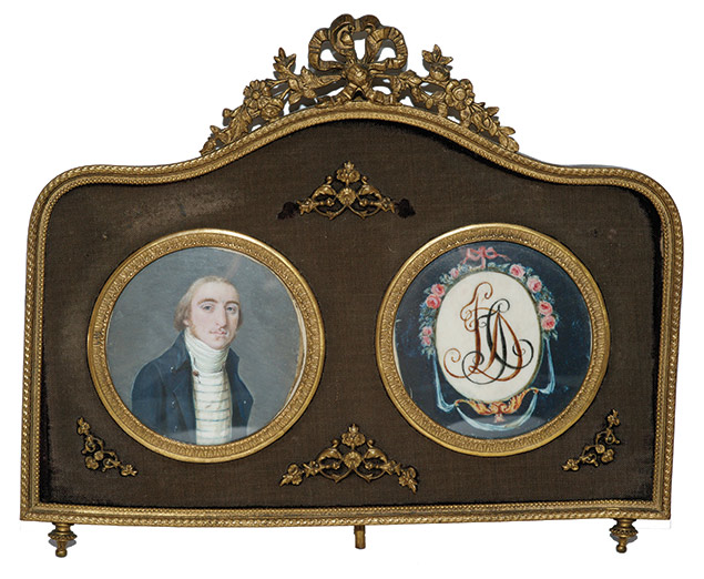 2 miniatures rondesCadre en laiton du XIXe siècle, comportant 2 miniatures rondes de 60 mm de diamètre. Celle de gauche représente un portrait d'homme et celle de droite figure quatre lettres entrelacées dans un médaillon peint entouré d'un décor de...