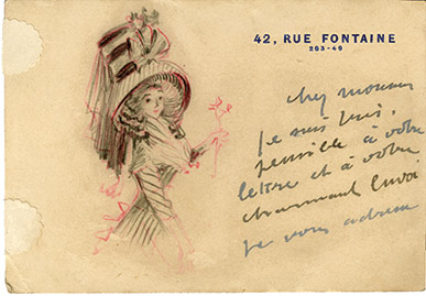 Lettre avec dessinCarte autographe signée avec dessin aux crayons de couleurs. 2 pages in-12 oblongues. Joli dessin à la mine de plomb, rehaussé de rouge représentant une élégante jeune femme. « Je suis très sensible à votre lettre et à votre...