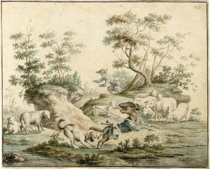 AquarelleD'après la fable de La Fontaine « Le loup devenu berger » Aquarelle 19 x 23,5 cm. Auteur non identifié.