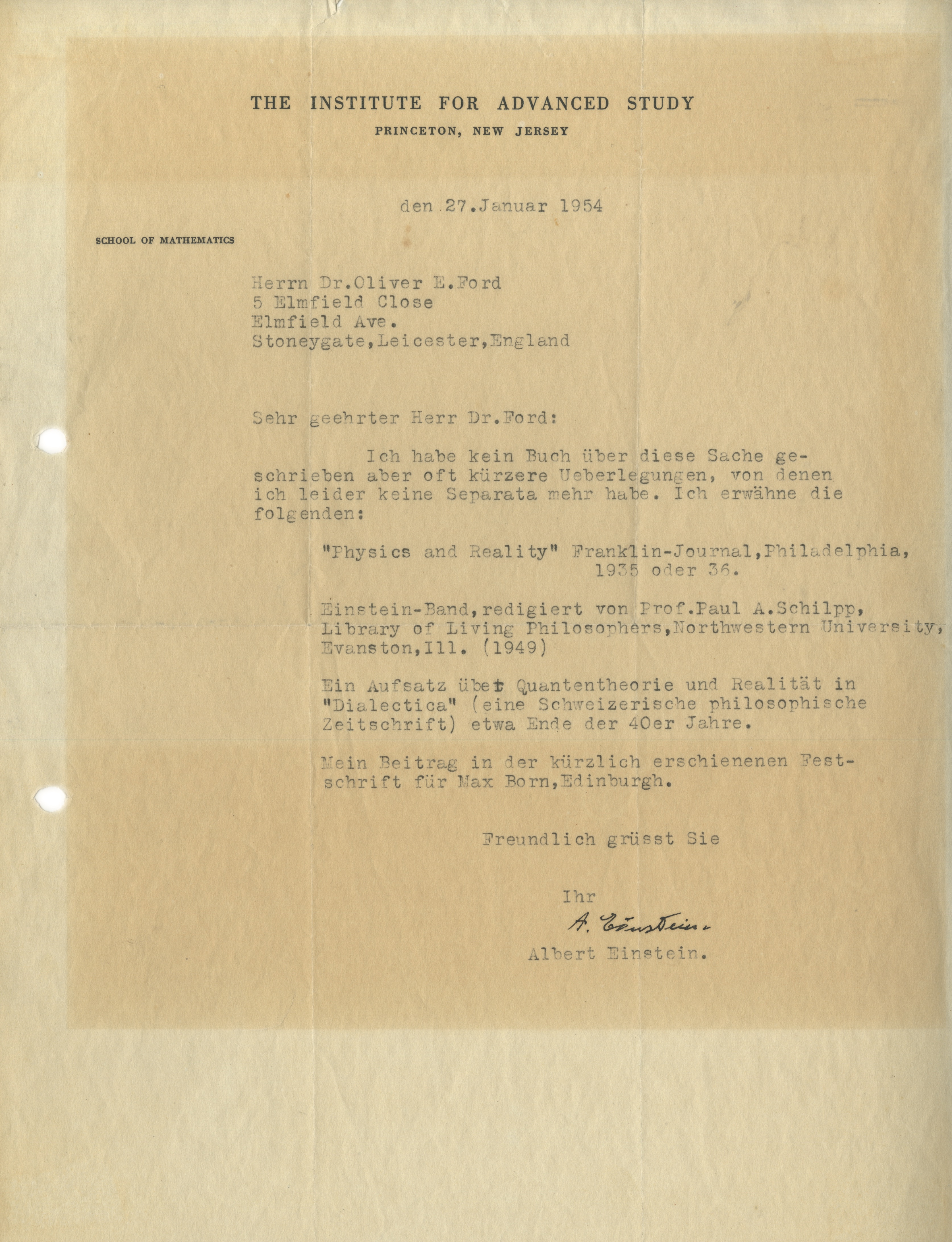 Lettre signéeLettre dactylographiée signée « A. Einstein » adressée au Docteur Oliver E. Ford, physicien qui avait collaborer avec Einstein et collaborer aux idées liés à la gravitation et cosmologie. 27 janvier 1954 ; 1 page grand in-4°sur...