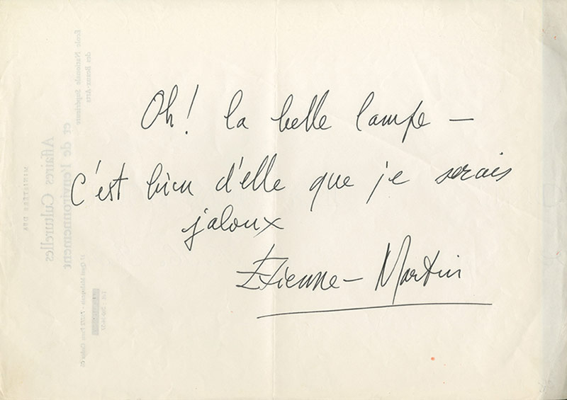 Pièce autographe signéePièce autographe signée. Sans date ; 1 page in-4° oblongue. Texte écrit pour la photographie de Bruno de Mones.« Oh ! la belle lampe. C’est bien d’elle que je serais jaloux. »