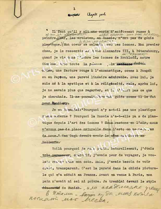 Tapuscrit avec corrections autographesTapuscrit avec corrections autographes et une 1 lettre signée (écrite par sa femme, signée par lui en 1953). Le tapuscrit est une ébauche d’un entretien entre un journaliste et Chagall. Renvoyé à ce dernier, le peintre le corrige en...