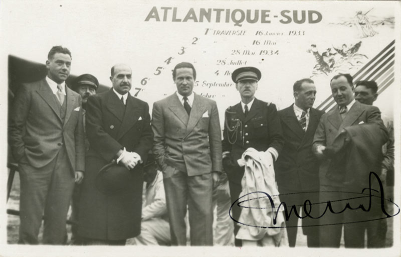 Photographie signéePhotographie signée. 1934 ; 9 X 14 cm.Cliché pris devant l’Arc en ciel, avec son équipage (Domergue, Laverin, Giaroli et Claver). Cliché Keystone-France.Il est fait commandeur de la Légion d’honneur en 1934. Il disparaît en vol,...