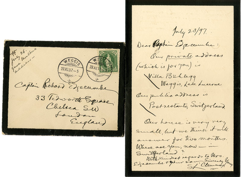 Lettre autographe signéeLettre autographe, signée « SL Clemens », adressée au capitaine Richard Edgecumbe. [Weggis], 23 juillet 1897 ; 1 page in-8°, enveloppe timbrée avec adresse autographe jointe.Il lui envoie son adresse en Suisse. « Our house is very...