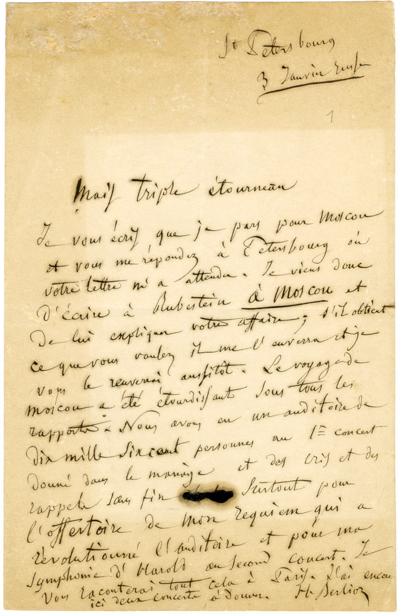 Lettre autographe signéeLettre autographe signée. Saint-Pétersbourg, « 3 janvier russe » [22 décembre 1867] ; 1 page in-4°. Petit trou du à l’encre acide, restauré.« Mais triple étourneau, je vous écris, que je pars pour Moscou et vous me répondez...