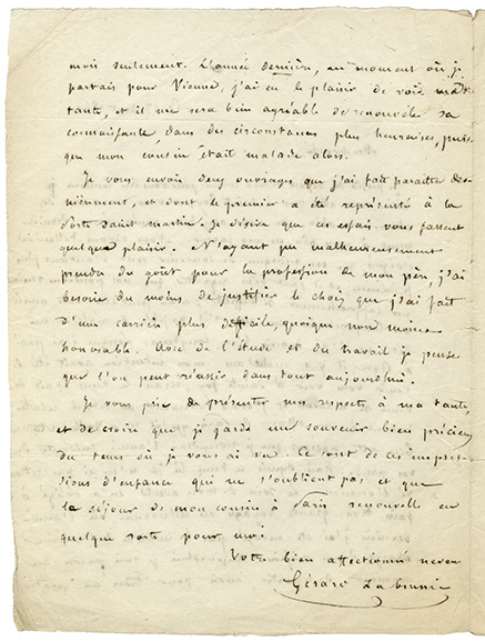 Lettre autographe signéeLettre autographe signée « Gérard Labrunie », adressée à son oncle Jean Labrunie. 17 août 1840 ; 2 pages in-8° à lencre sur papier, pliures, petit trou sur la page dadresse dû au décachetage (sans atteinte au texte).« Je...