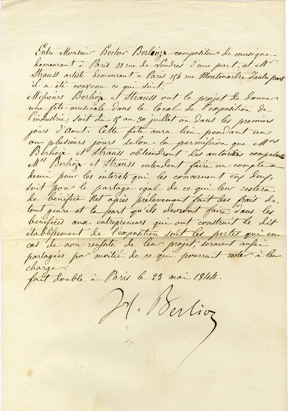 Pièce signéePièce signée. Paris, le 23 mai 1844 ; 1 page in-folio. Contrat entre Hector Berlioz et M. Strauss concernant un projet de fête musicale dans le local de lExposition de lIndustrie, soit du 15 au 30 juillet ou « dans les premiers...