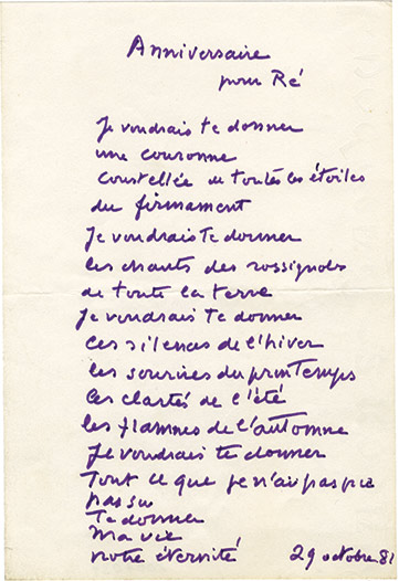 Poème autographe dédié à sa femme, intitulé « Anniversaire pour Ré »Poème autographe dédié à sa femme, intitulé « Anniversaire pour Ré ». 29 octobre 1981 ; 1 page in-8°....