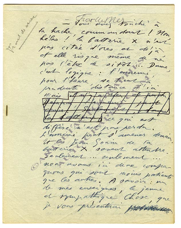 Manuscrit autographe signéManuscrit autographe signé « Front de mer ». [1940] ; 14 pages in-4°. Manuscrit sans doute incomplet du début.Récit de batailles navales. Article sans doute publié dans Gringoire de mars 1940.