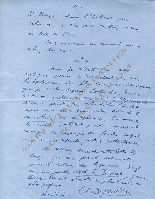 Lettre autographe signéeLettre autographe signée, adressée à M. Vecchini. Nice, 23 janvier 1951; 4 pages in-4°, enveloppe timbrée jointe.Superbe lettre sur le roman de Pierre Benoit, Les Agriates : « Je suis très gravement malade, mais je serais mourant...