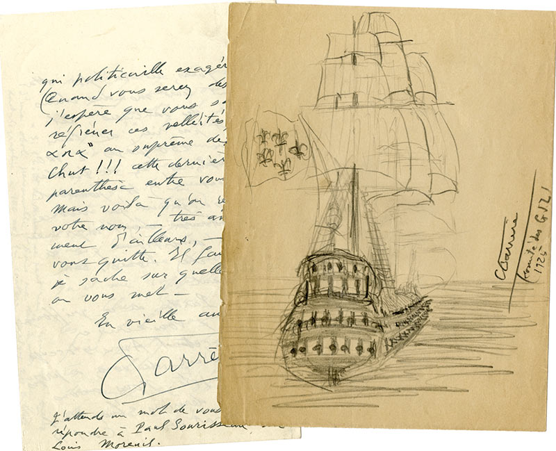 Dessin autographe signé et lettre autographe signéeDessin autographe signé. 1925 ; 1 page in-8°. Dessin au crayon noir, représentant un galion du XVIIe siècle, exécuté pendant la séance du Comité de la Société des gens de lettres, le 15 décembre 1925.On joint une lettre...