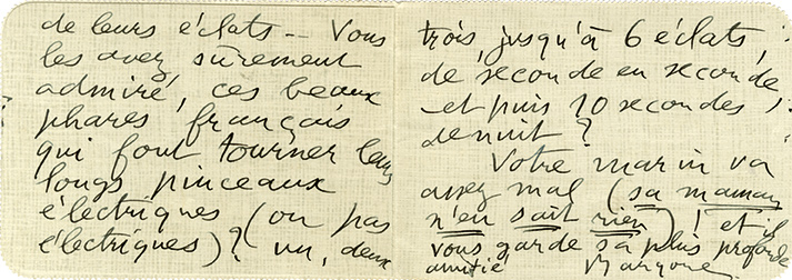 Lettre autographe signéeLettre autographe, signée de son véritable nom, « Bargone », adressée à Madame Dussouchet. À bord de l’Ernest Renon. 29 septembre 1913 ; 6 pages in-12.Divagation (de son lit, précise-t-il) sur la couleur des phares. « Je n’ai...